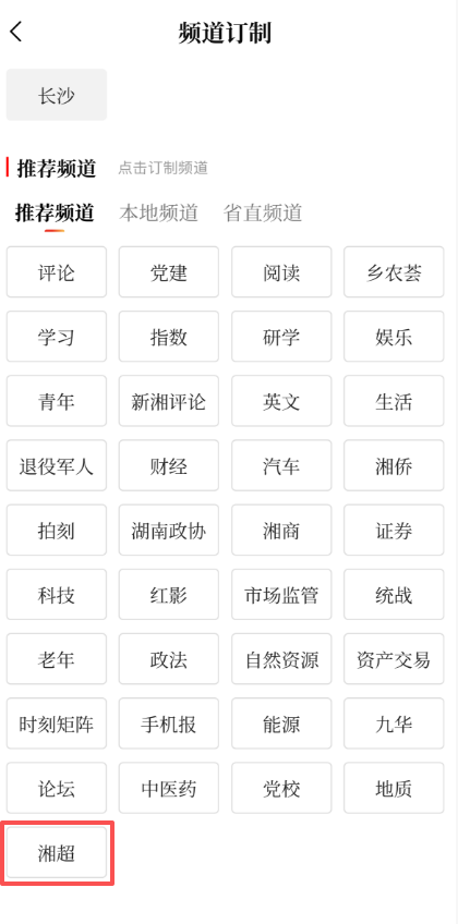 打开时刻新闻App,点击右上角“+”进入“频道订制”,在“推荐频道”中点击选择“湘超”。